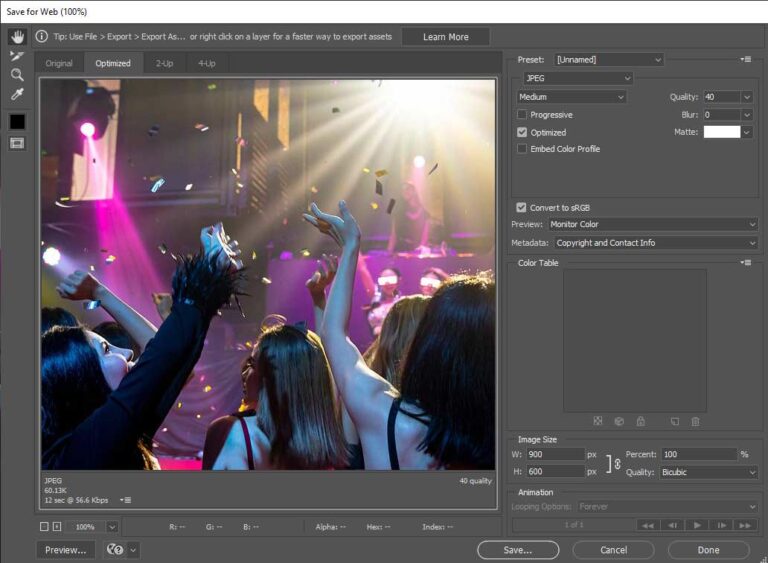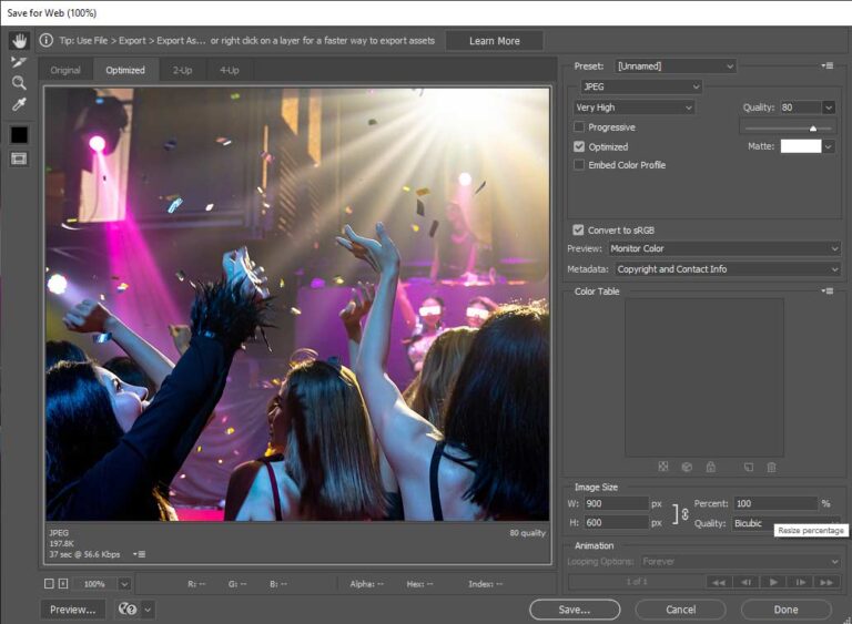 Taking an image of the same pixel dimensions (900px X 600px) and saving them as JPEG and Gif Formats.